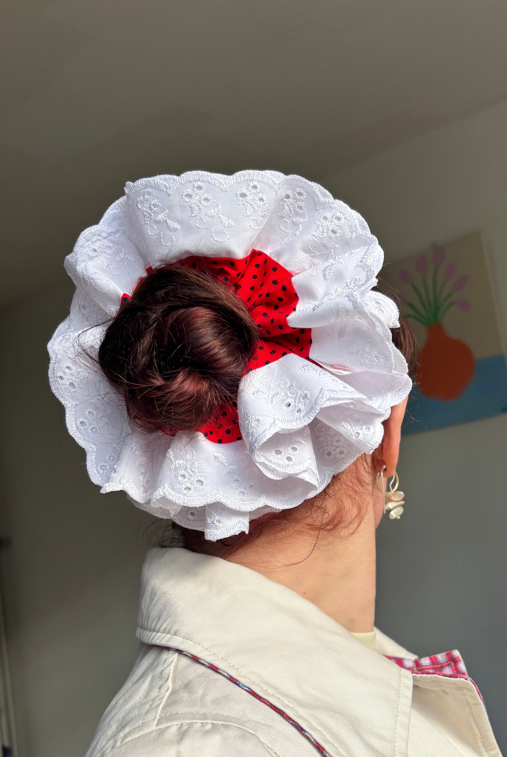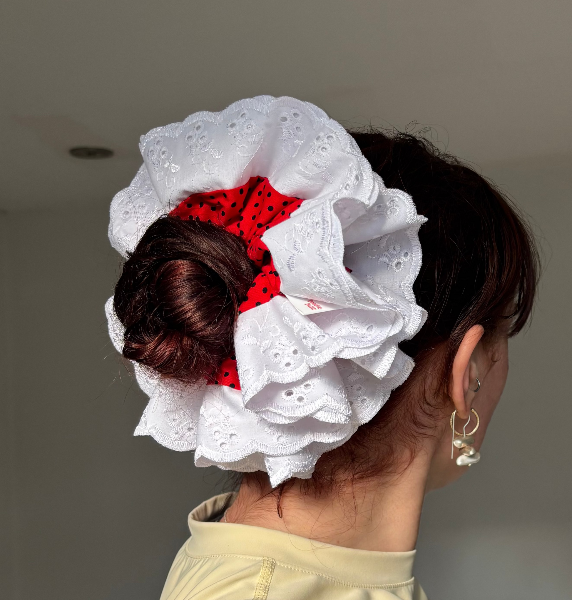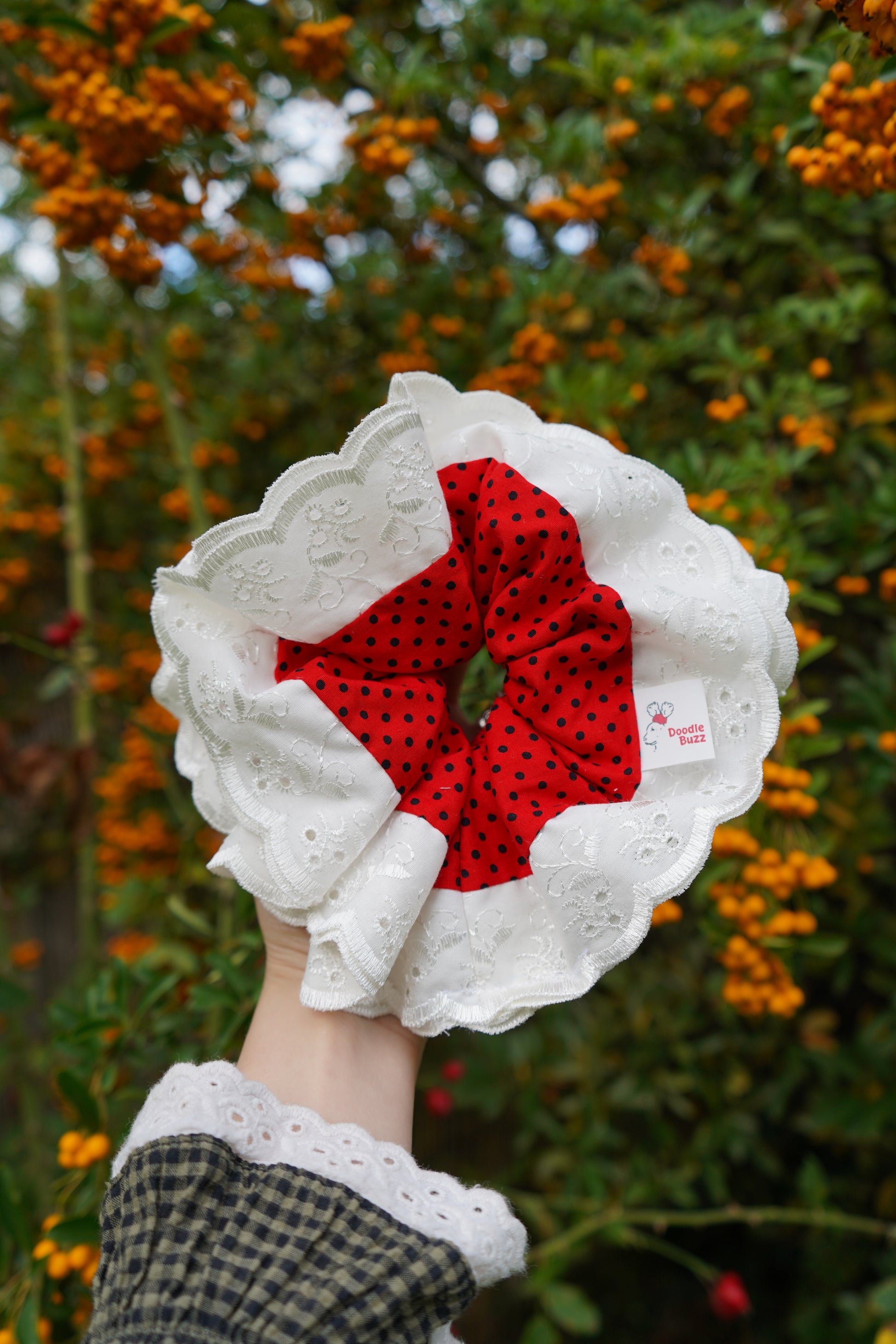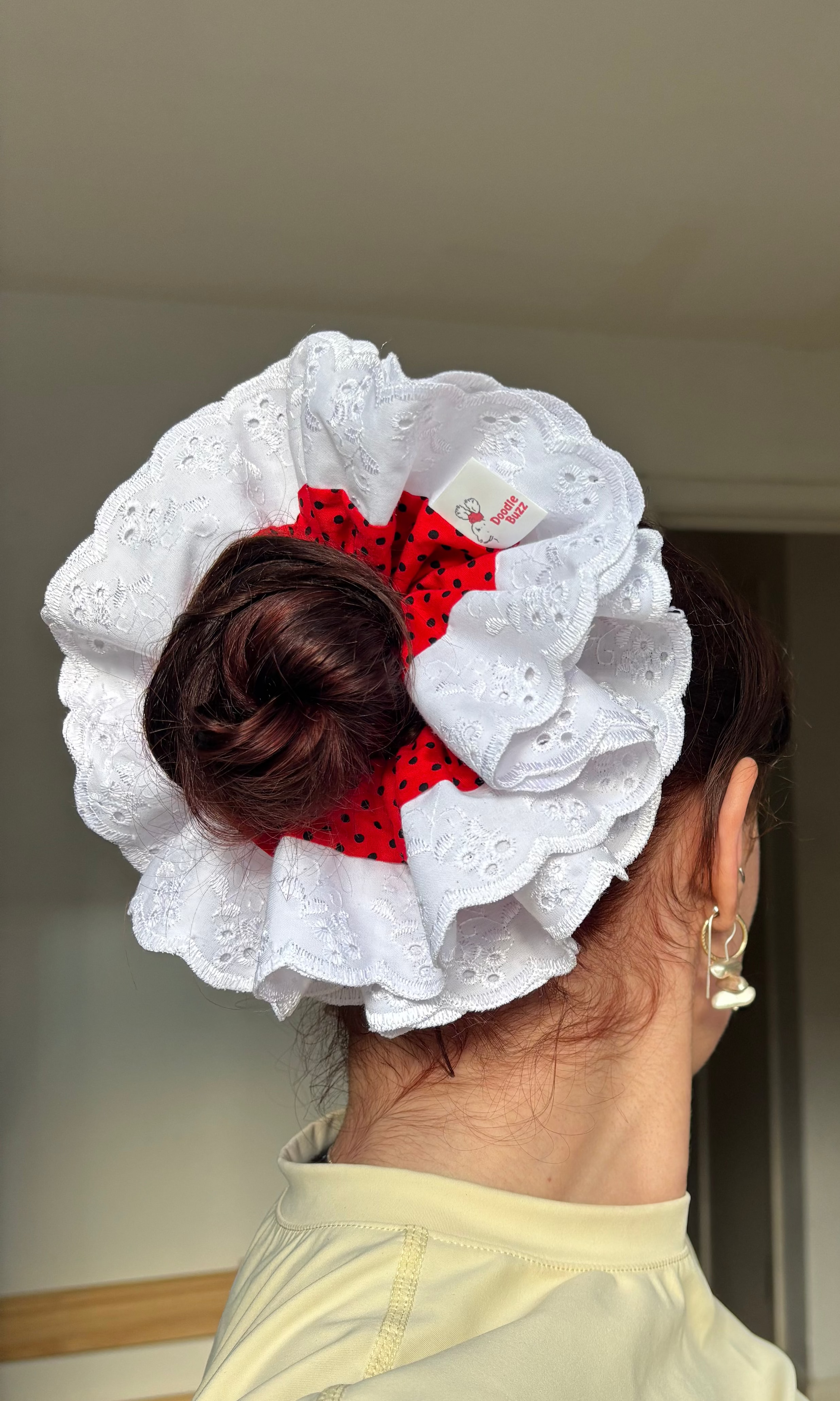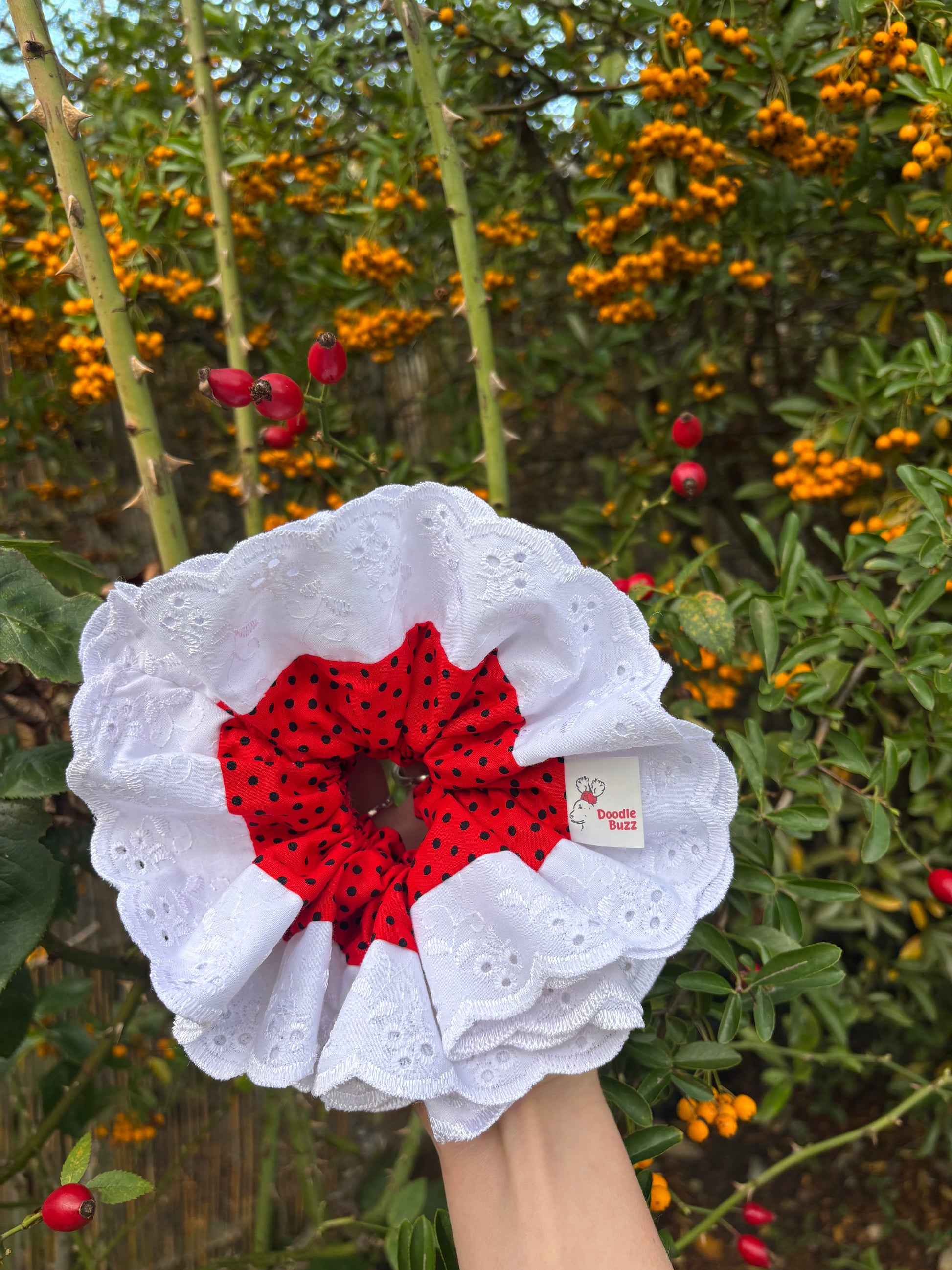 Add a splash of fun to your look with our Red and Black Polka Dot Regular Doodle Buzz! Featuring bold red and black polka dots accented by a crisp white trim, this scrunchie brings playful charm to any hairstyle. Perfect for adding a pop of color and personality, it's a cheerful accessory that keeps your hair stylishly secure all day long.